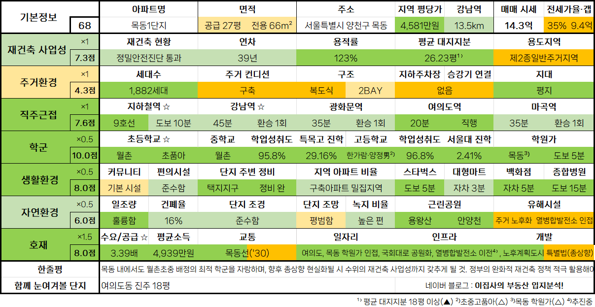 - 목동 내에서도 월촌초중 배정의 최적 학군을 자랑하며, 향후 종상향 현실화될 시 수위의 재건축 사업성까지 갖추게 될 것. 정부의 완화적 재건축 정책 적극 활용해야