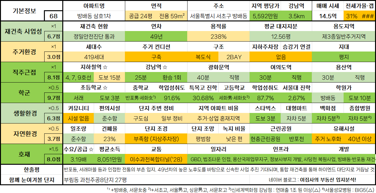 - 반포동, 서래마을 등과 인접한 전통의 부촌 입지. 49년차의 높은 노후도를 바탕으로 신속한 사업 추진 기대되며, 통합 재건축을 통해 하이엔드 대단지로 거듭날 것