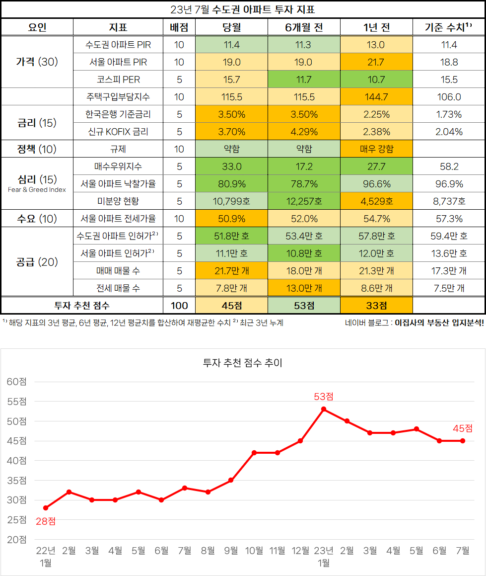 - 짙은 초록색일수록 투자 우호적, 짙은 노란색일수록 투자 비우호적 지표입니다.
