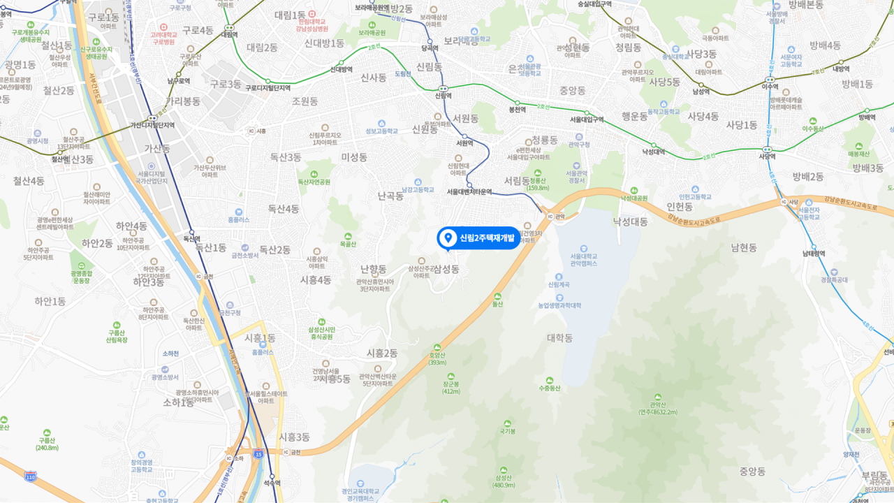 신림2구역은 신림1구역보다도 외곽에 위치한다는 단점이 있으나, 단지 뒤편에 위치한 난곡로를 따라 추후 개통될 난곡선으로 비교적 빠르게 접근할 수 있다는 장점 또한 가지고 있습니다. 아울러 이제 막 신통기획 심의를 통과한 1구역에 비해 2구역은 이미 이주까지 거의 완료되어 비교적 빠른 시일 내에 입주가 가능하죠. 신림뉴타운을 둘러싼 관악산까지의 거리도 조금 더 가깝고요.