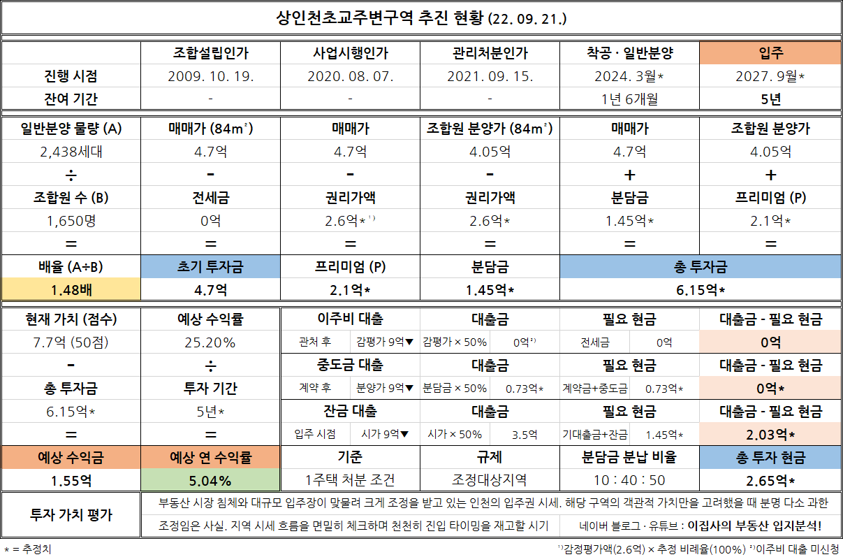 그러나 현재 부동산 시장이 급속도로 침체되고, 인천 지역의 대규모 입주장까지 맞물리면서 인천에서도 호재에 대한 기대감이 높은 지역부터 시세가 큰 폭으로 조정되고 있는 모습입니다. 상인천초교주변구역의 경우 GTX 호재와 더불어 아직 완공되지 않은 입주권 매물이라는 특수성까지 겹쳐 인근에 비해 그 조정세가 특히 가파른 모습인데요. 현재 작년 이맘때에 비해 약 2억 원 이상 조정된 프리미엄 2억원 극초반대까지 가격대가 하락해 있는 상황입니다.