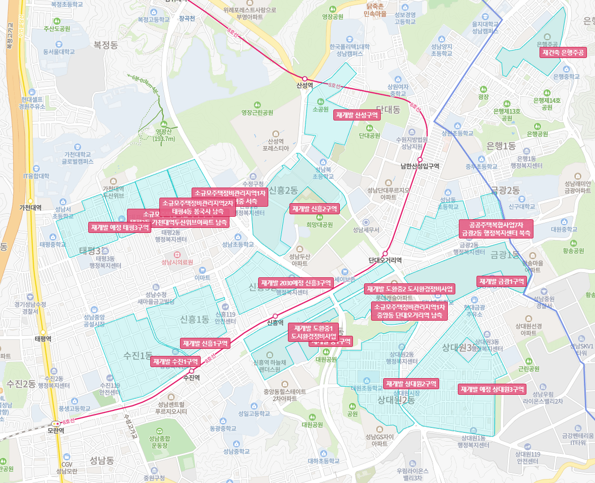 구성남 재정비지구는 현재 성남시 수정구, 중원구 일대 구도심에서 진행중인 수만 세대 규모의 재정비 구역들을 총칭하는 말입니다. 성남 구도심은 강남과 분당 사이에 위치한 훌륭한 입지와 더불어 빌라 밀집지역이 끝없이 늘어선 낙후된 환경으로 인해 지역 전체를 통으로 재개발하기 좋은 조건을 갖추고 있는데요. 이러한 특성으로 인해 성남시와 LH는 현재 순환재개발 방식을 채택하여 구도심 정비사업을 진행 중에 있습니다. 순환재개발이란 지역을 몇 개의 구역으로 나누어 먼저 한 구역을 개발한 뒤, 입주가 완료되는 시점에 새로운 구역을 개발하는 식으로 지역 전체를 순차적으로 개발해 나가는 방식을 말하는데요. 이러한 방식은 재개발 구역 주민들이 정비사업이 진행되는 동안 타 구역에서 전세로 거주할 수 있어 주거 안정이 보장된다는 장점이 있으며, 공공주도 재개발이므로 사업 진행 속도 또한 비교적 빠르다는 장점이 있습니다. 반면 마찬가지로 공공재개발이라는 한계로 인해 단지 고급화가 어려우며, 일반분양가가 낮게 책정된다는 단점 또한 존재하죠.
