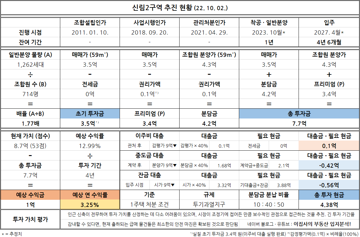 현재 신림2구역 59m² 배정 물건의 총 투자금은 약 7.7억 원으로, 약 11억 원에 달하는 84m² 배정 물건에 비해 상대적으로 가격이 매우 저렴한 편입니다. 이는 금리 급등 및 아파트 시장의 향후 부정적인 전망으로 인해 자금 조달이 쉽지 않은 조합원들이 소형 매물을 일부 수익 실현하는 과정으로 보여집니다. 작년 이맘때만 해도 서울 신축 25평형 입주권을 7억 원대에 매수하는 것은 결코 쉬운 일이 아니었는데, 급등하는 금리가 참으로 무섭긴 무섭습니다. 반면 대출에서 비교적 자유로운, 넉넉한 현금을 들고 있는 매수 대기자 분들께는 작금의 상황이 최소한의 안전 마진을 갖춘 서울 신축 입주권을 주워담을 수 있는 좋은 기회라고 보여집니다.