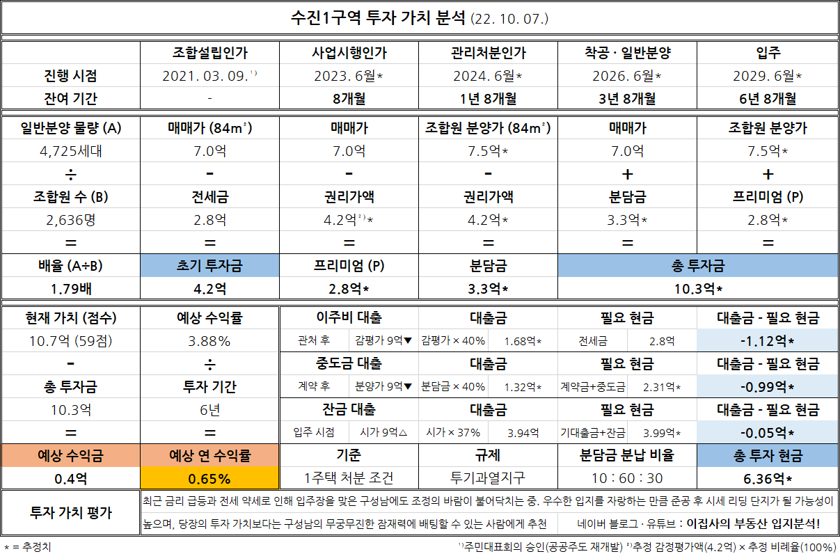 최근 입주장을 맞은 구성남에도 조정의 바람이 불어닥치면서 수진1구역의 프리미엄도 작년에 비해 최소 1억 원 이상 하락한 상황인데요. 구성남 재정비지구와 시세가 연동되어 있는 산성역포레스티아 등 신축 대단지들이 생각보다 크게 조정받고 있어, 구성남의 입주권 시세 또한 당분간은 흐름이 좋지 않을 것으로 보입니다. 다만 수진1구역의 경우 우수한 입지를 자랑하는 만큼 준공 후 시세 리딩 단지가 될 가능성이 높아, 구성남의 무궁무진한 잠재력에 배팅할 수 있는 사람에게는 수진1구역이 충분히 매력적인 투자처가 될 수 있을 것으로 보입니다.