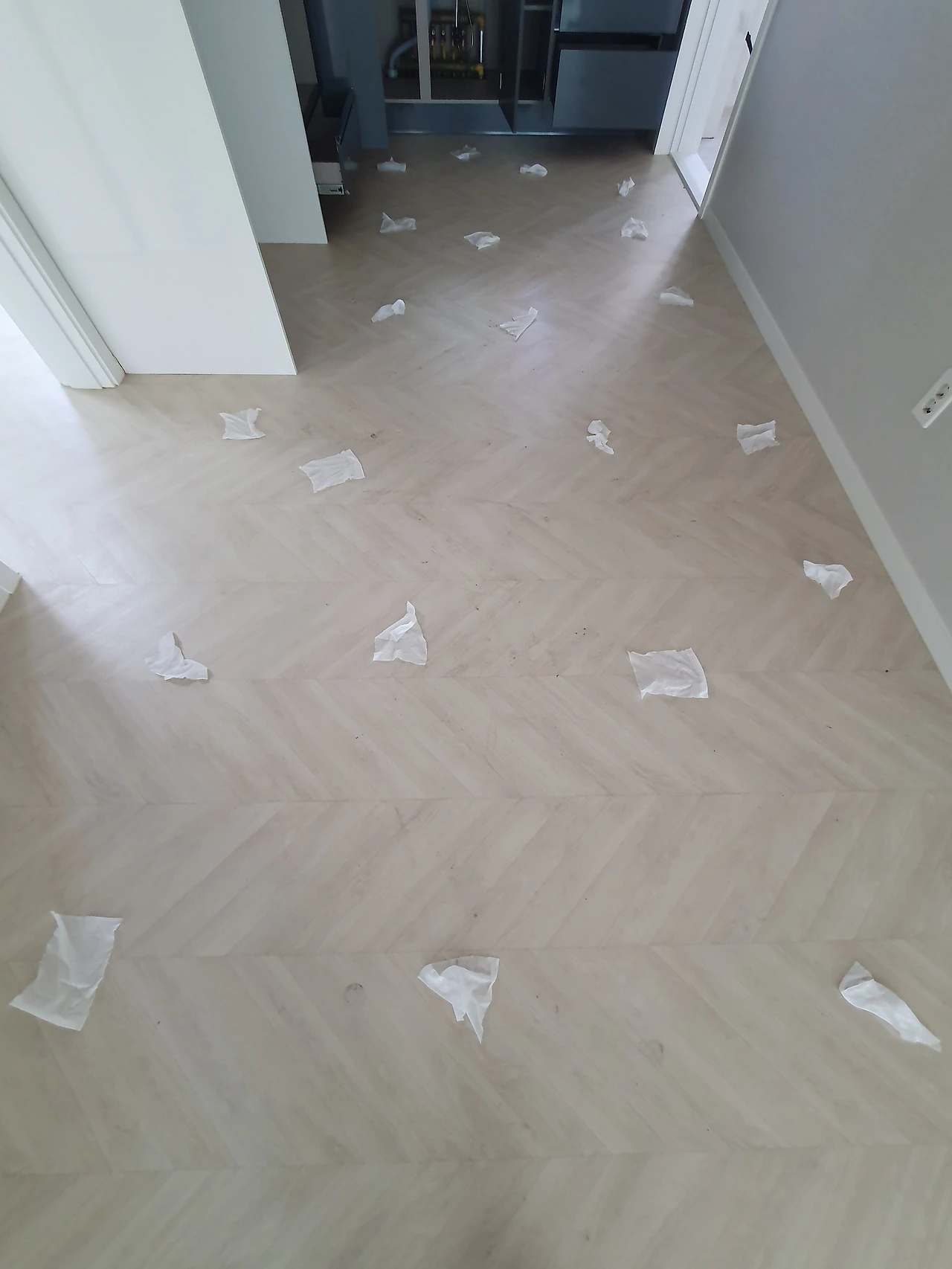 둘째로, 바닥을 꼼꼼하게 닦기 시작했다. 처음에는 발에 물티슈를 밟고 휘휘 저으면서 닦았는데, 바닥에 묻어있는 흔적이 잘 안 지워졌다. 더 박박 닦아내야 했다. 어차피 닦을 거 한 번에 깨끗이 닦는 편이 효율적이라 생각했다. 그래서 내린 결론은 손으로 박박 문지르는 거였다.