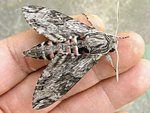 날개길이는 80~105mm다. 이 나방의 기본 색상은 회색 톤이지만, 복부에는 넓은 회색 등줄무늬가 있고, 측면에는 흰색 테두리가 있는 분홍색과 검은색 줄무늬가 있다. 뒷날개는 밝은 회색이며, 폭이 넓고 어두운 교차선이 있다.