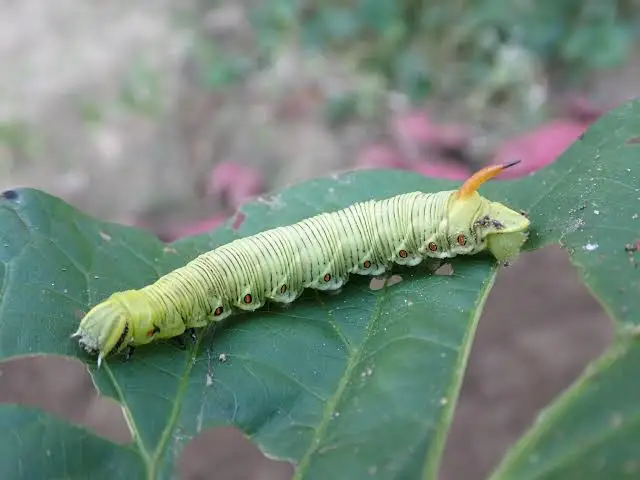 애벌레는 Convolvulus의 잎을 먹기 때문에 라틴어 이름은 "convolvuli"다. 기록된 다른 식용 식물에는 천남성과(Araceae), 메꽃과(Convolvulaceae), 콩과(Leguminosae), 아욱과(Malvaceae)에 속하는 다양한 식물이 포함된다. 유충은 보통 5령까지이지만 드물게 6령이 되는 개체가 있다.