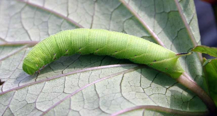 종령으로 크기는 9cm 전후다. 4령까지는 거의 녹색으로 탈피하여 색이 바뀔 수 있다. 무늬가 눈에 띄는 것이나 검은 몸의 것도 있어, 그 색채는 변화가 풍부하다. 엉덩이 쪽에 뿔이 붙어 있지만 독은 없다. 성숙한 애벌레는 땅속으로 들어가 번데기가 된다. 번데기에는 긴 소련환이 붙어 있어 박각시의 번데기의 특징이다. 번데기로 월동한다. 유럽, 아시아, 아프리카, 호주, 뉴질랜드 전역에서 흔히 볼 수 있다.