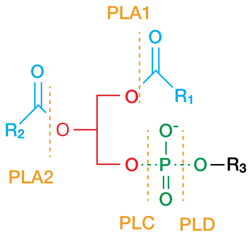 인지질분해효소는 인지질을 지방산 및 기타 친유성 물질로 가수분해하는 효소입니다. A, B, C, D라는 4가지 주요 클래스가 있으며, 이들은 촉매 하는 반응 유형에 따라 구분됩니다. 포스포리파아제 A2는 손상되지 않은 레시틴 분자에 작용하여 두 번째 탄소 원자로 에스테르화된 지방산을 가수분해합니다. 그 결과 생성되는 생성물은 리소레시틴과 지방산입니다. Phospholipase A 2는 꿀벌, 블렌니 및 독사 독에 존재하는 효소입니다.
