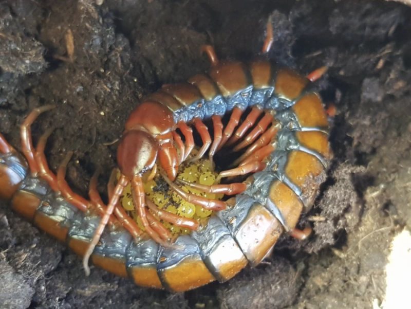 수컷은 성숙한 정자 세포인 정낭을 함유한 캡슐을 생산하는데, 이 캡슐은 짝짓기 중에 암컷의 정낭이라고 불리는 저장소에 저장된다. 암컷은 미성숙한 난자, 즉 난모세포를 수정하여 어둡고 보호된 곳에 낳는다. 암컷은 50~80개의 알을 낳고, 알이 부화하고 새끼 지네가 한 번 탈피할 때까지 조심스럽게 알을 보호한다. 위험이 감지되면 암컷은 새끼를 품에 안아 안전하게 보호한다.