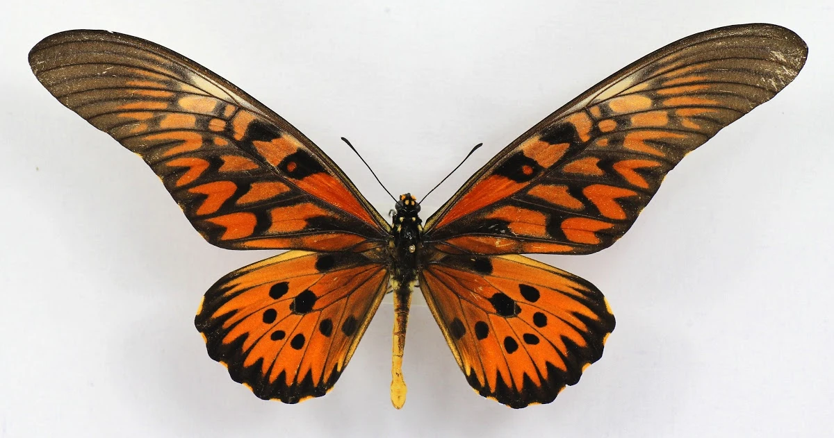 날개길이는 18~24cm로 아프리카에 서식하는 나비들 중에서는 최대크기로 앞날개의 길이와 넓이 부분에서는 전 세계 나비들 중에서도 최대급이다. 다른 나비들과 다르게 수컷이 암컷보다 훨씬 크다. 날개는 길고 좁으며 바탕색은 주황색 갈색이고 검은색 표시가 있다. 이 나비는 매우 독성이 강하고 훨씬 작은 아크레아(Acraea)를 포함한 다른 유사한 나비와 비슷하게 보이기 때문에 천적이 없을 수도 있다.