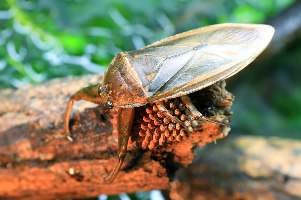 부화 직후의 1령 유충은 노랗지만 몇 시간 만에 1령 유충 특유의 줄무늬가 나타나 수면에 낙하한 지 반나절 정도 만에 뿔뿔이 흩어져 간다. 수컷 성충은 유충들이 낙하지점에 머물고 있는 약 반나절 동안 다가오는 외적을 쫓으며 유충들을 보호하고, 유충들이 모두 흩어진 곳을 둘러보고 난괴를 떠난다. 부화 후 유충은 탈피를 5회 반복하여 성충으로 탈바꿈한다. 1령 유충은 부화한 지 몇 시간 만에 독특한 줄무늬가 나타나지만 탈피하여 2령 유충으로 변태 하면 거의 사라지고, 3령 유충이 되면 완전히 사라진다.