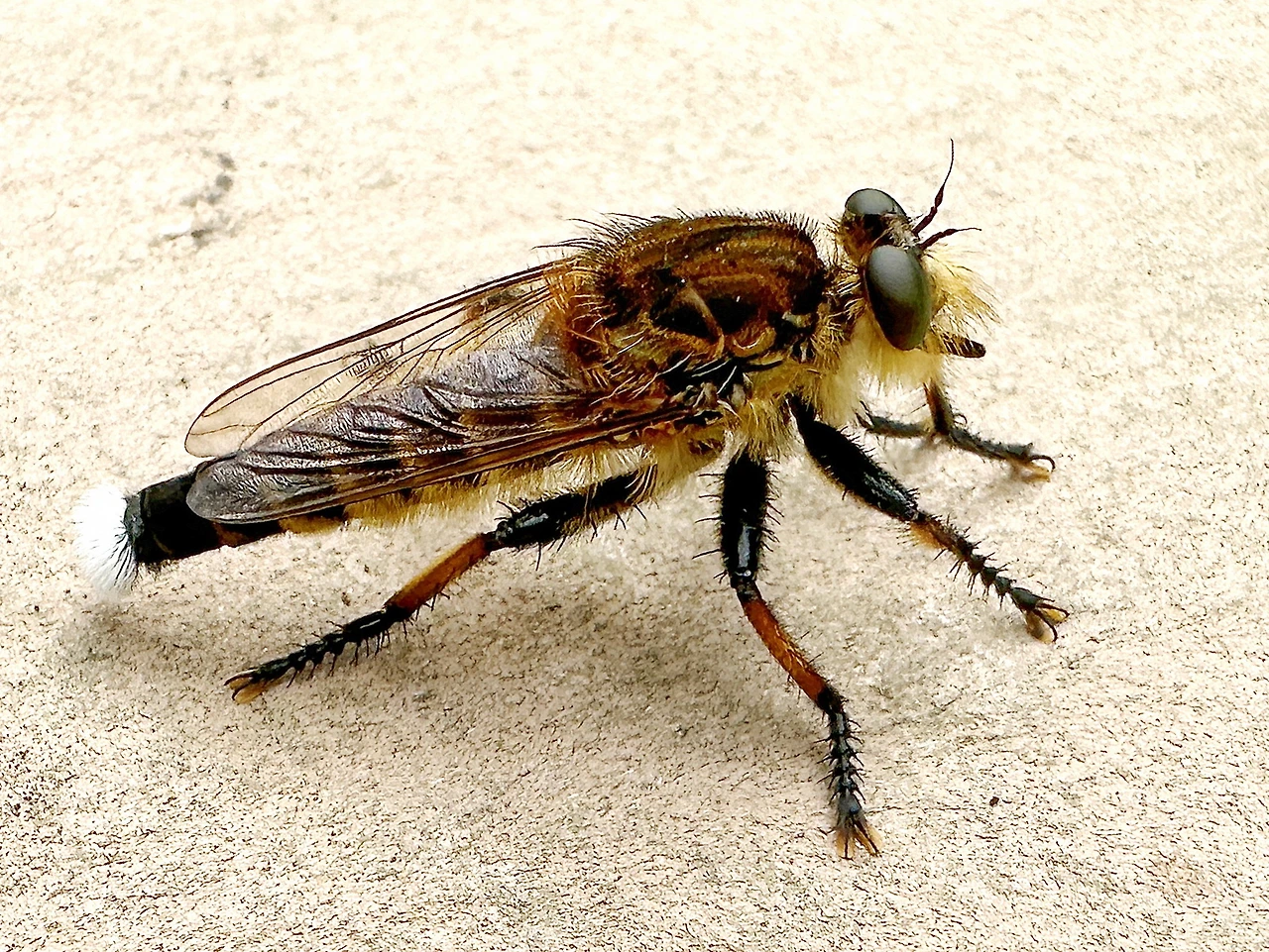 성충의 몸길이는 약 23~30mm로 국내에 서식하는 파리매과에 속하는 곤충 중에서 가장 덩치가 크다. 수컷의 복부 끝에는 흰 털이 밀집해 있지만, 암컷에는 없다. 전신에 노란 털이 박혀 있고, 복부는 이 털로 인해 검은색과 황갈색의 줄무늬로 보인다. 다리는 검은색이지만 정강이 부분만 황갈색이다. 시력이 발달하여 몇 미터 앞에 있는 먹이도 찾을 수 있다.