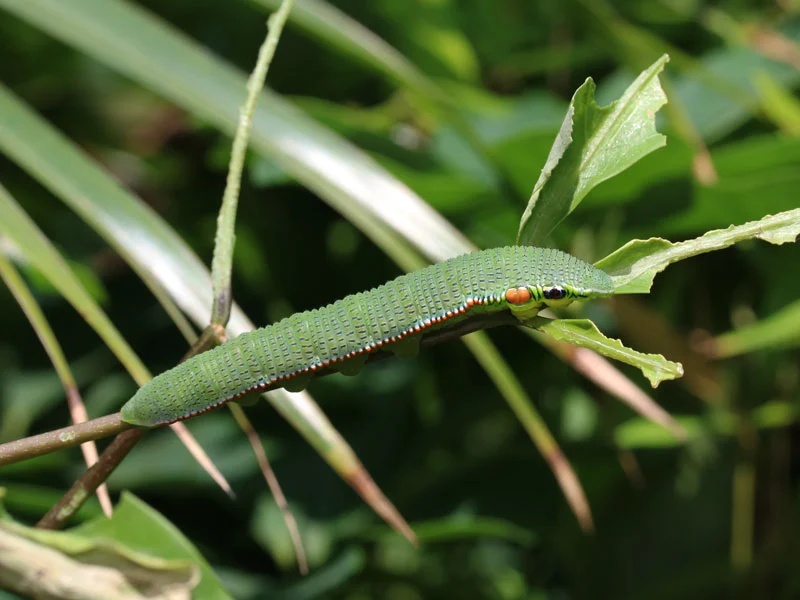 이 독은 도마뱀과 같은 천적으로부터 방어하기 위해 쓰였을 것으로 추정된다. 번데기는 색깔은 녹색이고 날개 윗부분에 옅은 황토색 반점이 있으며, 머리에서 꼬리까지 같은 색상의 좁은 측면 띠가 있고, 그 위에 갈색 선이 겹쳐서 복부 마디까지 뻗어 있다. 복부 마디와 날개 아랫부분에는 검은색 반점이 희소하게 있다. 성충은 4월부터 11월에 걸쳐 4~5회 발생한다. 필리핀과 인도, 중국, 인도네시아, 말레이시아에 분포한다.