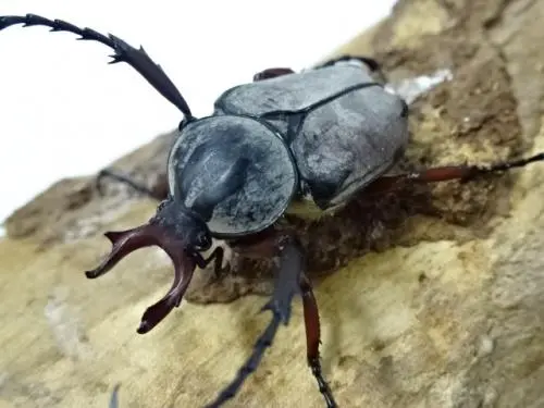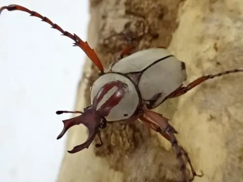 수컷의 두각이 길게 발달했고, 앞가슴과 앞날개는 회백색 피복으로 덮여 있다. 앞 흉부의 중앙에는 한 쌍의 검은 세로 줄무늬가 눈에 띈다. 암컷은 수컷과 달리 두각이 없고 색도 수수한 편이며 크기도 작다. 참나무나 밤나무 같은 활엽수의 수액이 나오는 곳이나 나뭇가지를 선호하며, 불빛을 보고 날아오는 야행성 곤충이다. 버려진 바나나와 같은 달콤한 과일도 먹기 때문에 떨어진 과일 근처에서 발견되기도 한다.