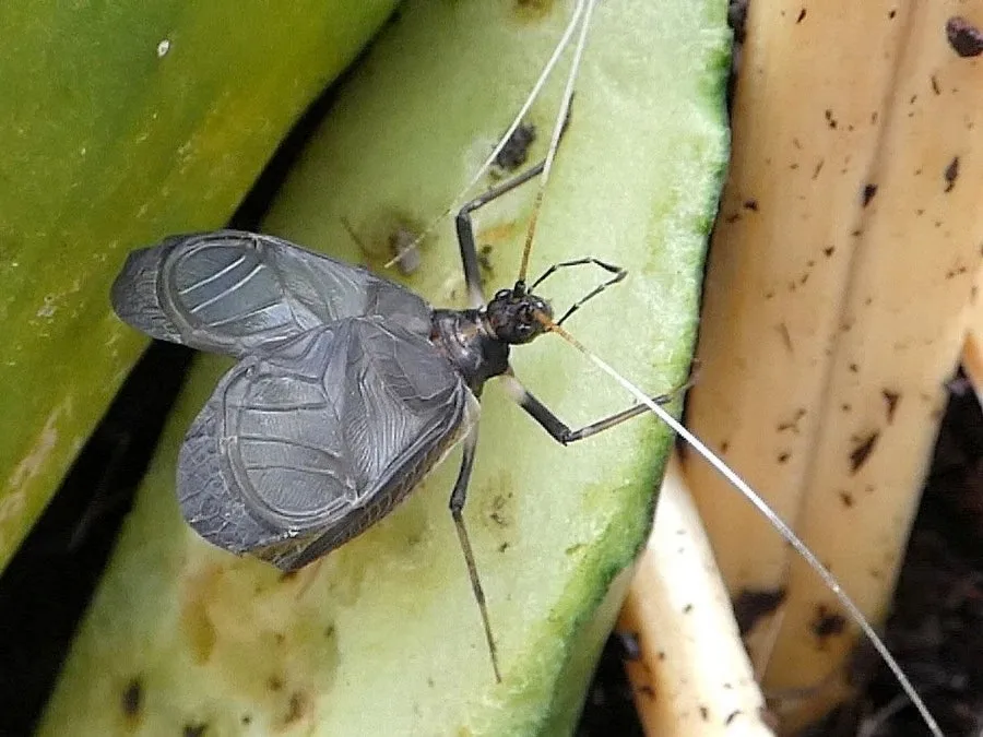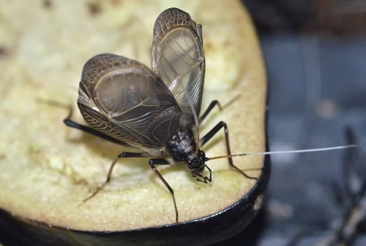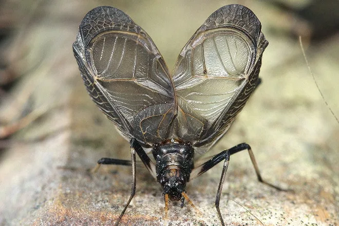 머리는 작고, 겹눈과 달리 홑눈은 퇴화되어 있다. 야행성 때문에 더듬이가 길어져 있으며, 더듬이는 흰색 부분이 많고 일부는 검은색이다. 수컷의 날개는 폭이 넓고 맥이 발달해 있으며, 굵은 맥의 일부는 줄처럼 되어 있어 날개를 수직으로 세워 가늘게 운다.