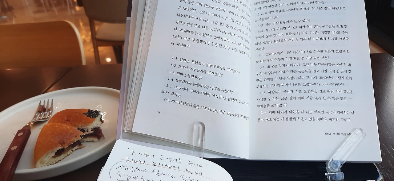 ...... 피켓을 들고 일인 시위를 할 용기도 없다. 마음에 드는 옷을 보면 사고 싶고 평생 치킨을 먹지 않고 살 수도 없을 것 같다. 하지만 친구들이 기후 위기로부터 우리의 미래를 보장하라며 등교 거부 시위를 한다면 참여할 것이다. 비건을 위한 급식 식단을 따로 마련하라는 서명서에 내 이름을 적을 것이다. 계속 텀블러와 스테인리스 빨대를 들고 다닐 것이다. 임준석이 또 개똥 같은 말로 나를 모욕한다면 오늘 아빠에게 그런 것처럼 화를 내고 싸울 것이다. 위악보다는 위선이 낫다고, 망하고 싶으면 너 혼자 망하라고 확실하게 말할 것이다.