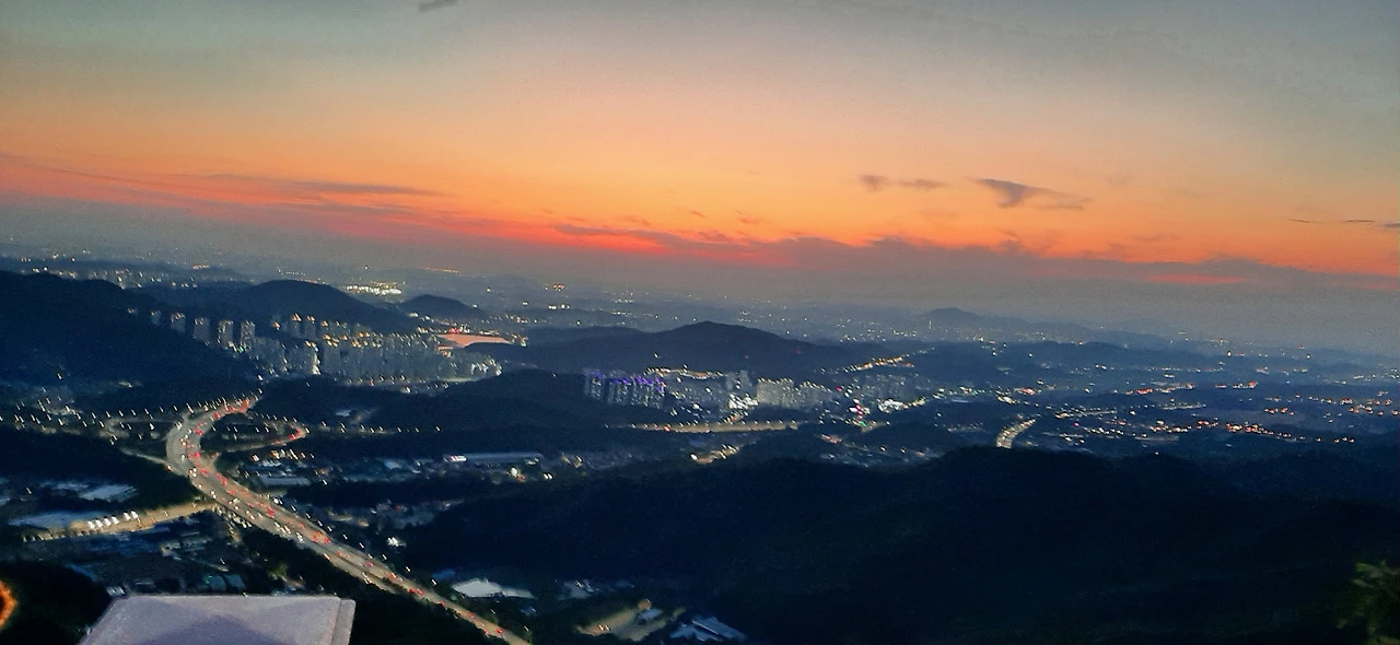 지난 금요일에는 남편과 저녁 7시 좀 넘어 수리산 수암봉을 올랐다. 조금 서두르면 산 위에서 장엄한 노을을 볼 수도 있을 것 같았다. 수암봉주차장에서 수암봉 (398m)까지 한 시간 정도 걸리던 가파른 코스를 40 여 분 만에 올랐다. 시나브로 산속이 어두워왔지만 헤드렌턴을 켤 정도는 아니었다. 땀에 흠뻑 젖어 숨을 헐떡이며 수암봉 데크에 도착했다. 잘했다 장하다 수고했다는 격려와 위로의 속삭임 같은 밤의 산바람이 사방에서 불어왔다. 그리고 하늘 가득 연하고 짙은 주황색 노을이 보석을 뿌려놓은 듯한 야경과 함께 눈앞에 펼쳐졌다. 아... 멋있다... 이쁘다... 좋다... 좋구나...