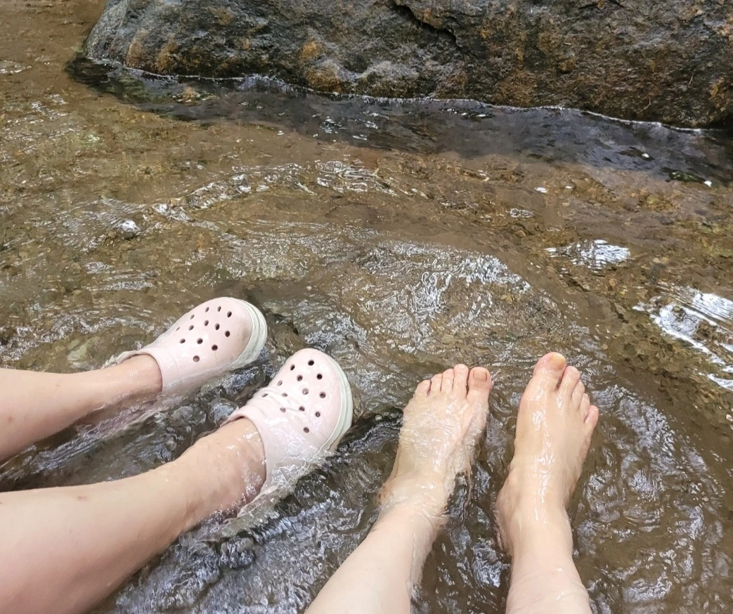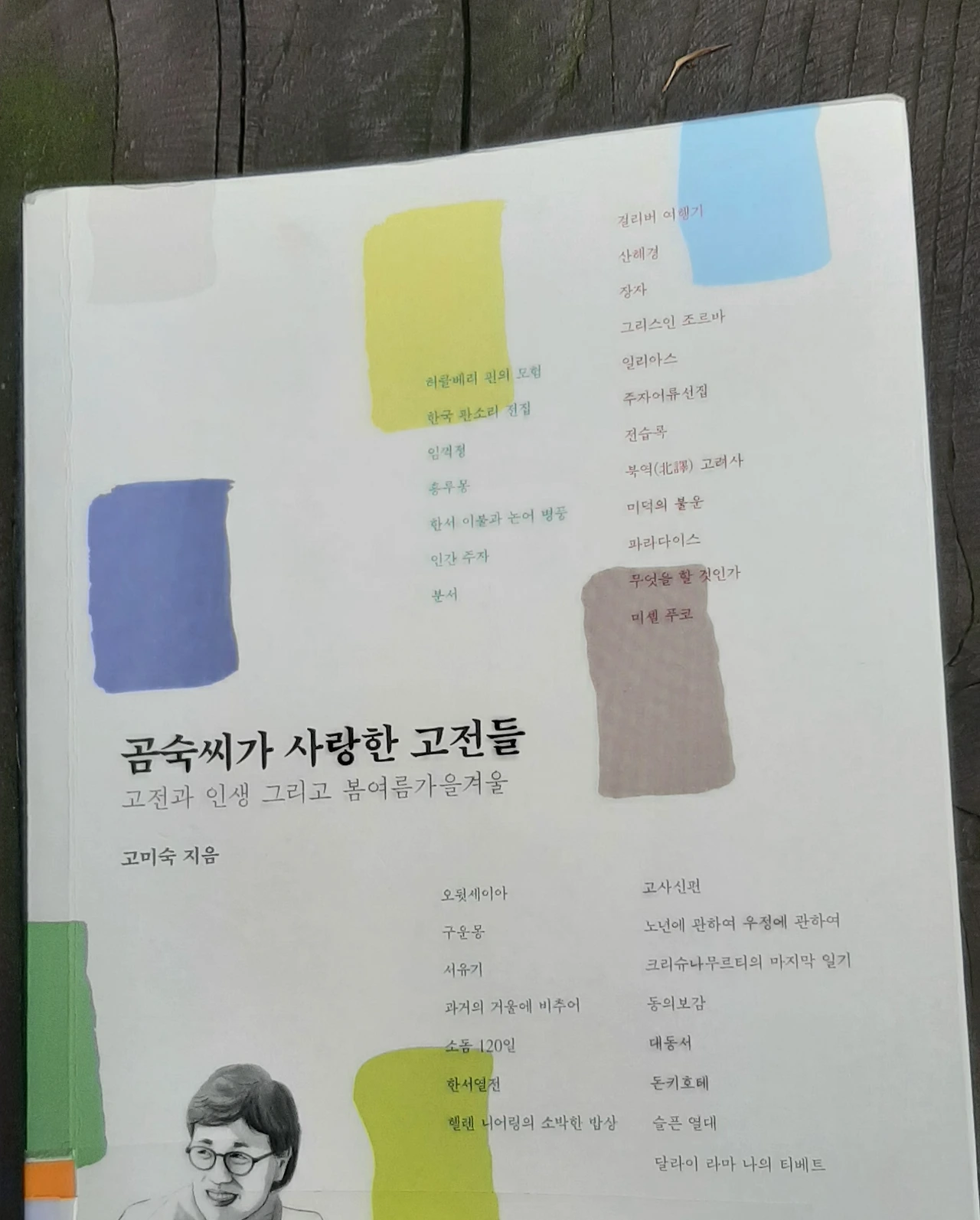 일주일이 지난 즈음에는 자기 집 근처에 있는 청계산 맑은 숲 계곡으로 소풍을 가자 했다. 김밥과 샌드위치를 준비할 터이니 나는 사과와 읽을 책을 챙겨서 오라 했다. 폭염으로 계곡물이 줄어들기는 했지만 돗자리를 깔고 발을 담그고 있기에는 아주 적당했다. 천천히 샌드위치와 김밥을 먹은 후 친구는 내가 가져간 '2024 현대문학상소설집'을 나는 친구가 가져온 '곰숙씨가 사랑한 고전들'을 읽었다. 책을 느리게 읽는 나는 '노년에 관하여 우정에 관하여'라는 한 챕터를 겨우 읽었는데 친구는 단편 세 편을 읽었다고 했다. 물가이기 때문에 앉아서 책 읽기가 불편할 수밖에 없었다. 그래서 나는 발목까지는 물에 담그고 앉아서 읽다가 서서 읽기를 반복했지만 친구는 한 곳에 자리 잡고 앉은 채로 이동 없이 읽었다.
