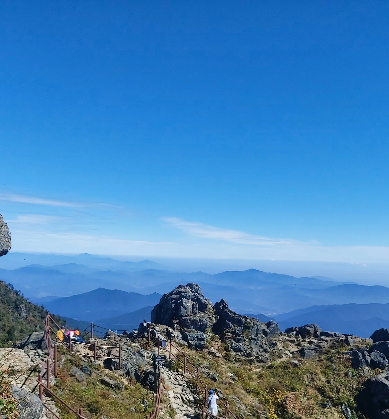 드디어 세 시간을 걸어 올라 해발 1,915m 천왕봉에 섰다. 정상석 옆엔 인증샷을 찍으려는 줄이 길었다. 우리는 인증샷 찍기를 포기했다.