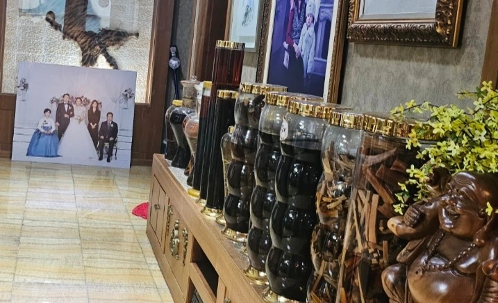집에 엘리베이터도 있다. 엘리베이터에서 내리면 현관에 ‘열락제’ 현판이 걸려있다. 그 아래는 절구통에 신안 천일염 소금이 가득 차 있다. 문을 열고 들어가면 금으로 된 장식장이 놓여있다. 연회장에는 탁구대도 있다. 집이 이백 평이다. 도우미들이 청소하다 말고 도망간다. 한번 오면 두 번 다시 오지 않는다.