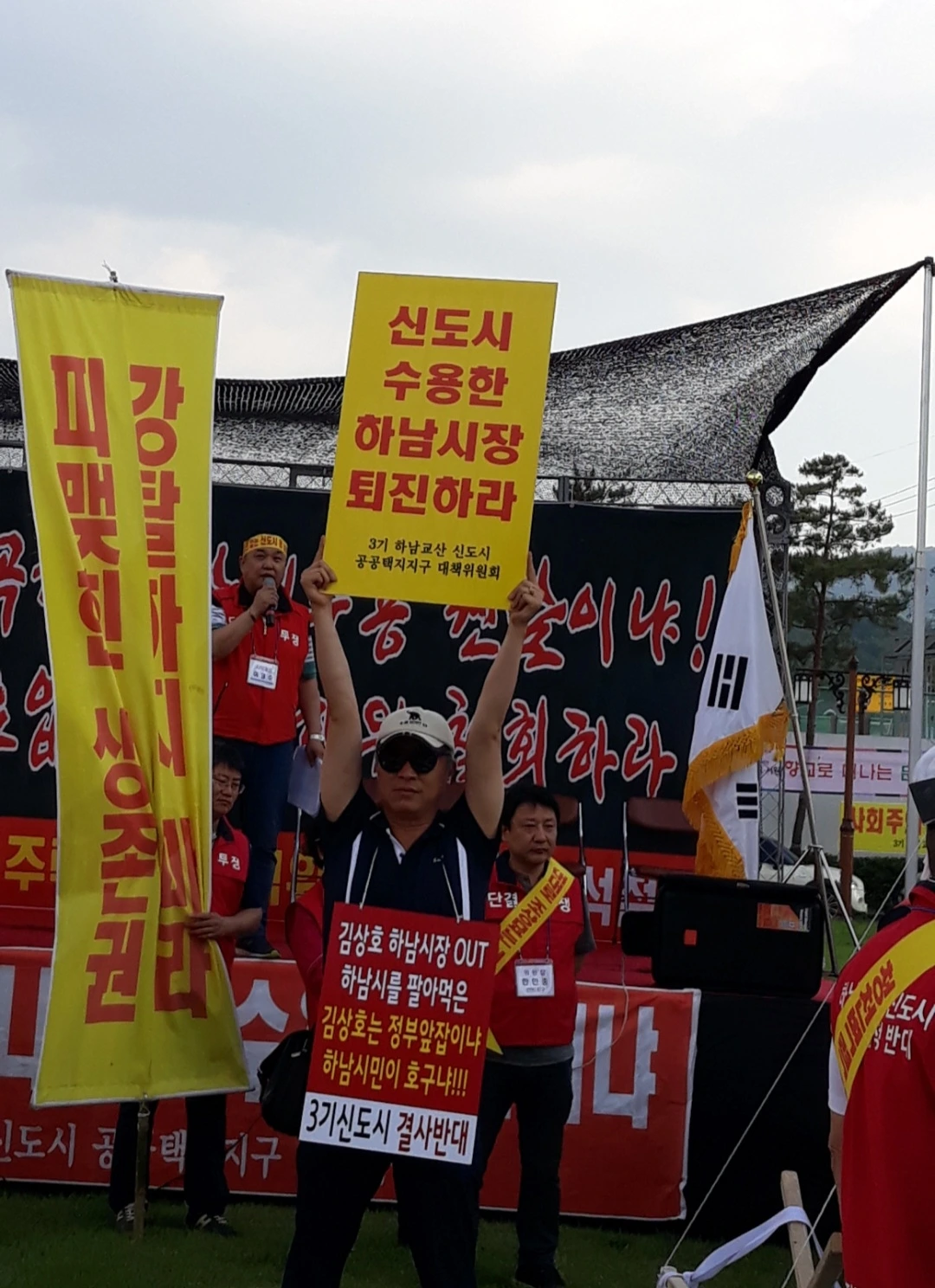 사실 플래카드는 하남시 입구에서 남한산성 밑 고골까지 근 5Km에 이르는 길 양쪽에 숲을 이루었다가 철거되기를 반복했다. 협상의 추이에 따라 늘어났다 줄어들기를 반복하면서 찬성과 반대의 희망 고문을 계속해 왔다. 그 눈에 보이는 증거가 바로 플래카드였다.