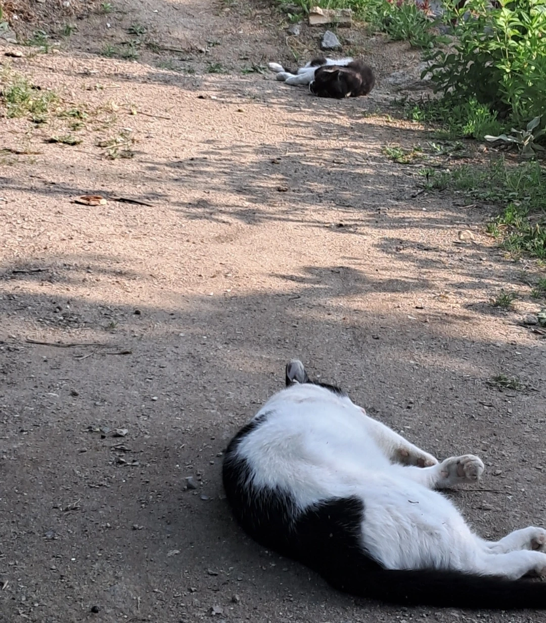 해가 넘어가자 까불이가 각시도도랑 지붕 위에서 뛰어내린다. 까불이는 나를 보고 배를 드러내놓는다. 까불이 부인은 저만치 앉아있다. 새끼들은 마당에서 뒹굴고 있다.