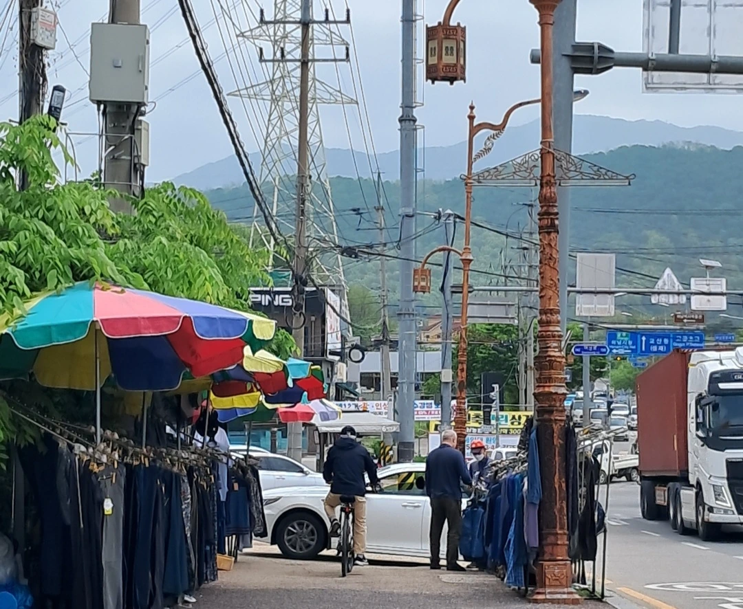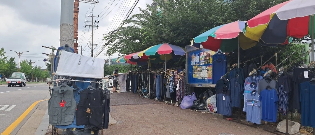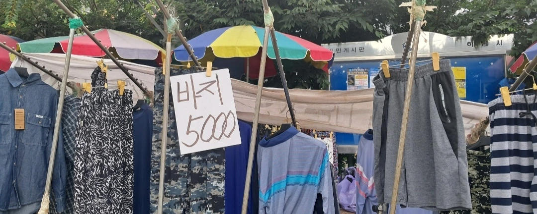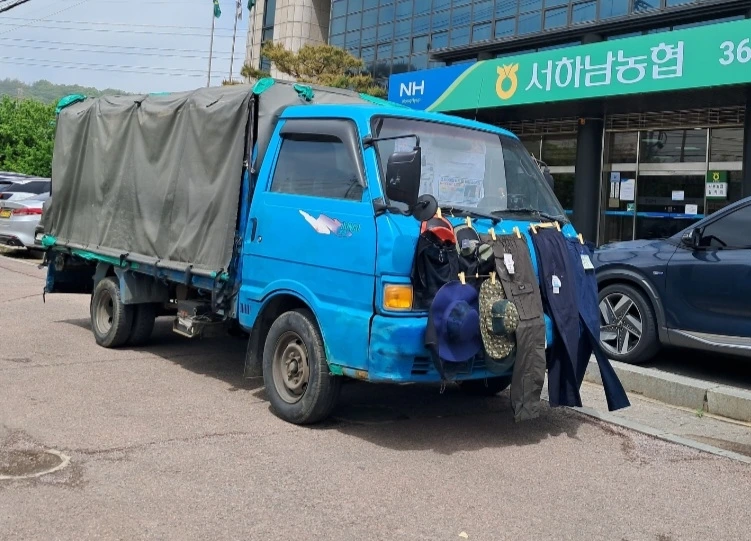 며칠 뒤 서부농협 앞에서 마을버스를 갈아타기 위해 기다리고 있었다. 정류장에서 3m쯤 떨어진 곳에 옷을 실은 트럭이 서 있다. 행거에 옷이 걸려 있었다. 몇몇은 옷걸이 걸린 옷들이 트럭에서 걸린 채 햇빛을 받고 있었다. 트럭을 분 순간 ‘없는 남편’ 바지 준다는 아저씨가 생각이 났다.