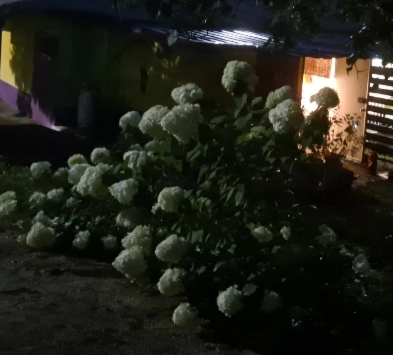 밤바람에 수국이 나를 보고 갸웃거리고 있다. 달빛이 흰 수국을 비추고 있다.