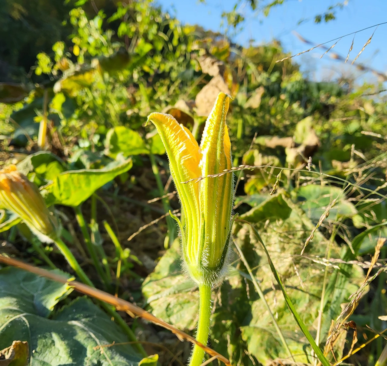 나는 호박꽃을 귀하게 여긴다. 꽃이 핀다고 호박이 다 열리는 것은 아니다. 열 개 꽃 중 한두 개만 호박이 열린다. 바람에 꽃이 떨어져 버린다든가, 저절로 떨어질 때도 있다. 호박이 열리는 꽃은 처음부터 꽃 뒤에 엄지손톱만 한 호박이 달려있다. 이게 점점 커 호박이 된다. 수꽃인가? 암꽃인가? 한 줄기에 암수가 같이 공존하는가. 알아봐야겠다. 올해는 역대급 무더운 날이 계속되자 주먹만 하던 호박이 여러 개 골았다. 그래서 살아남은 호박이 내게는 정말 고맙고 반가웠다.