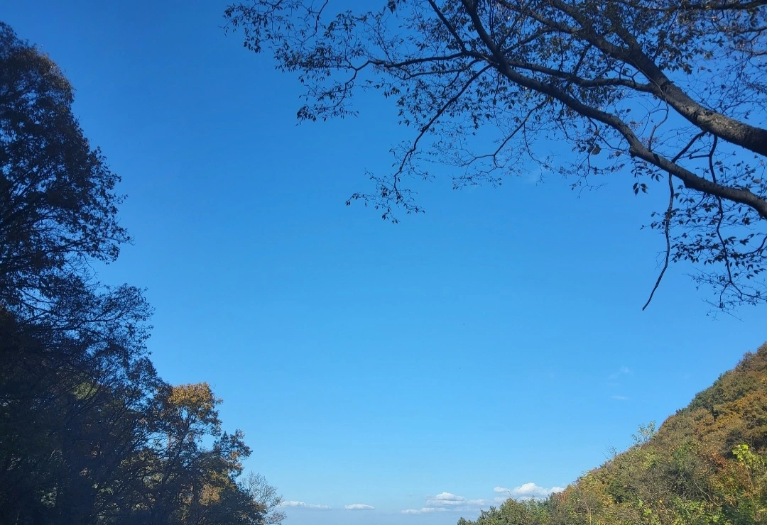 하늘이 아이 얼굴 같다. 그 하늘 아래 풀치랑 나랑 평상에 나란히 앉아 앞산을 바라보고 있다.