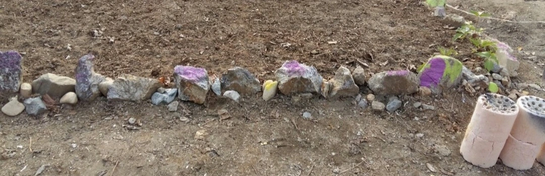 집 근처에서 주운 돌로 밭 테두리를 만들었다. 돌에 보라 연두 노란색으로 칠을 했다.
