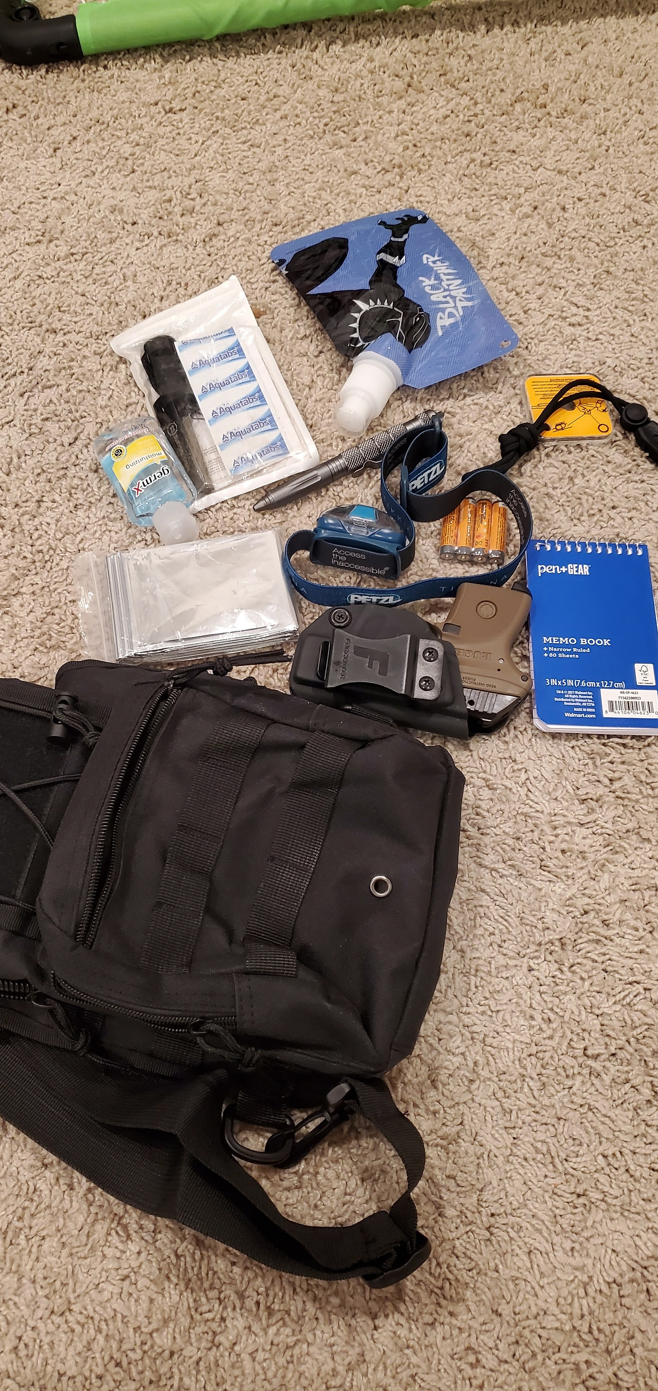 내 경우를 위한 내 주관적인 definition은 개념적으로 GHB는 EDC (Every Day Carry)와 BOB (Bug-out Bag) 사이이고 물리적으로는 훨씬 적은 부피여서 특히 차를 운전하거나 해서 장시간 그리고 장거리를 이동했을 때 필요한 물품들을 휴대하게 해주는 가방을 이야기한다. 배낭이라고 표현하지 않은 이유는 실제로 내가 슬링백 형태의 가방을 선택했기 때문이다. 나의 GHB에는 아래와 같은 물품들이 들어 있다. 특히 생존에 반드시 필요한 아이템들을 포함하려 궁리했다.