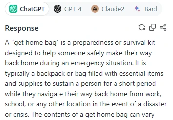 이번 편은 Get Home Bag (GHB)에 대해 이야기해보려고 한다. "What's get home bag?"이란 질문에 대한 ChatGPT의 응답은 다음과 같다.