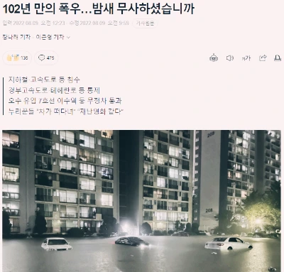 사실 위험하기도 하고, 힘들었던 운전이었지만 아이들 덕분에 여유있는 마음으로 집에 잘 도착했던 것 같다. 그리고 몇 년 만의 기록적인 폭우를 몸소 느껴보는 기회, 자연의 무서움을 체험해보는 기억에 남을 시간이었다. 오늘 뉴스에 인명피해까지 있다고 하니, 마음도 아프고 자연앞에 나약한 인간을 느끼면서 일상과 시간의 소중함을 깨닫기도 했다.