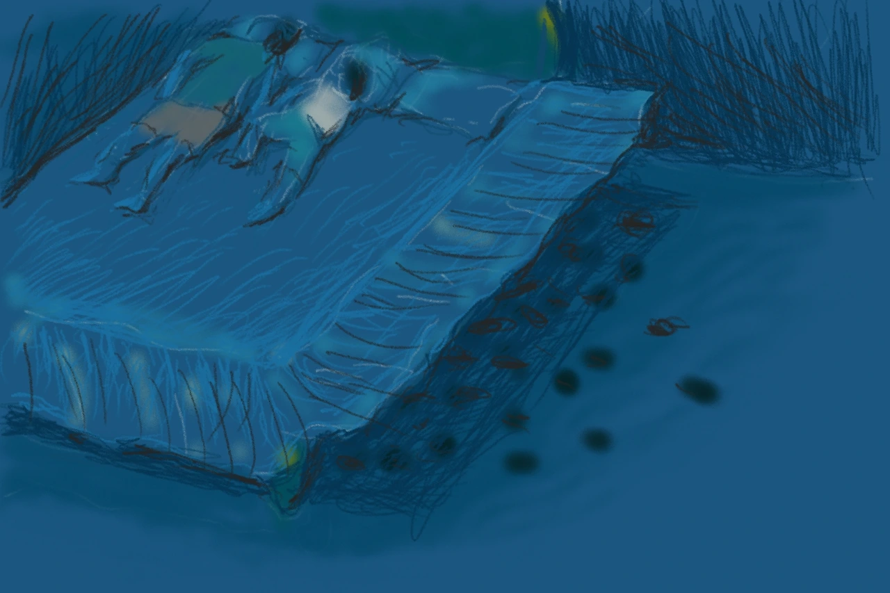 침대스커트가 위로 올라가니 컴컴한 침대 밑이 드러났고 그곳에서 무언가 나올 것 같은 공포감에 휩싸였을 때 어른 주먹만큼 한 솜뭉치 같은 검은 형체의 벌레들이 슬금슬금 기어 나왔다.
