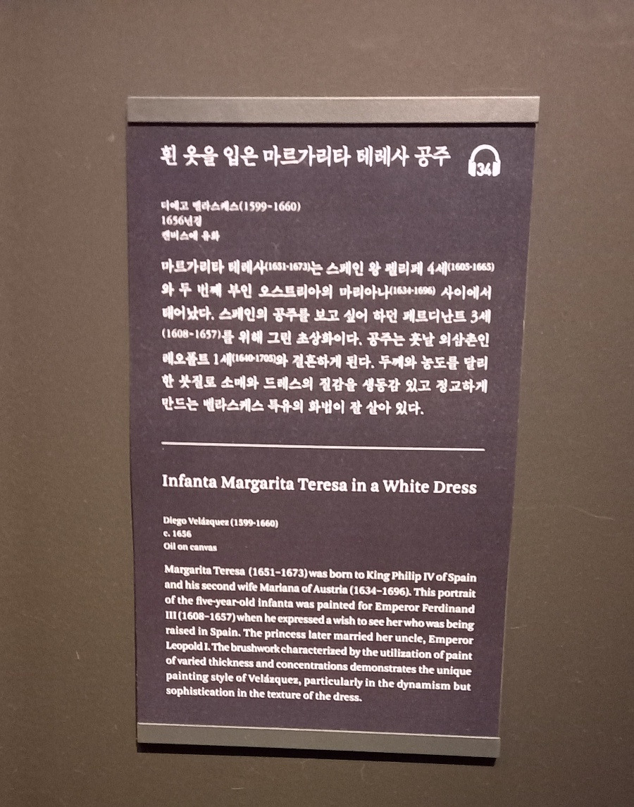 스페인 국왕 펠리페 4세의 장녀 마르가리타 테레사 공주 초상화 3점 중 생기발랄한 5살 때의 모습을 그린 작품이 이번에 전시되었다. 합스부르크 왕가는 특별한 혼인 정책을 폈고, 영토를 보전하기 위해서는 근친혼도 주저하지 않았다. 마르가리타도 어린 나이에 이미 외숙부인 신성로마제국의 황제 레오폴트 1세와 혼인하기로 약속되어 있었다. 펠리페 4세는 2~3년 간격으로 딸이 성장하는 모습을 그려 빈으로 보냈다. 오늘날 같으면 직접 보거나 화상통화로 약혼자의 얼굴을 확인하겠지만, 당시에는 초상화가 왕실 간 중요한 중매 수단이었다.