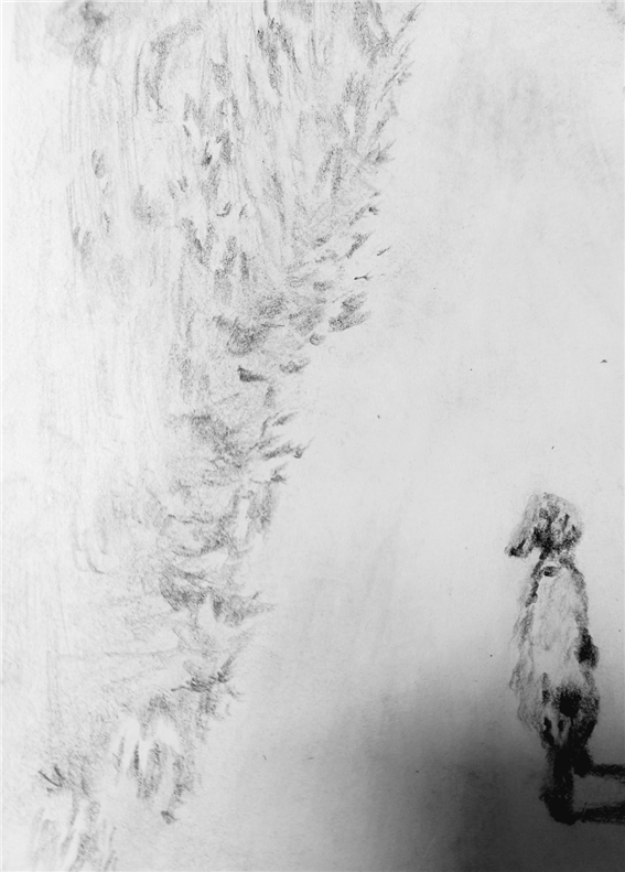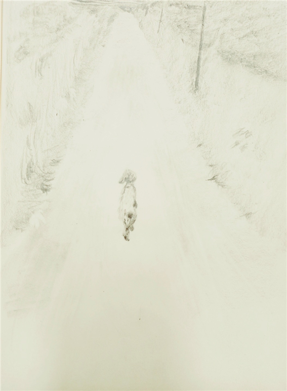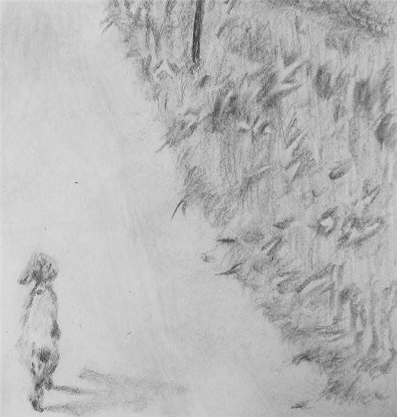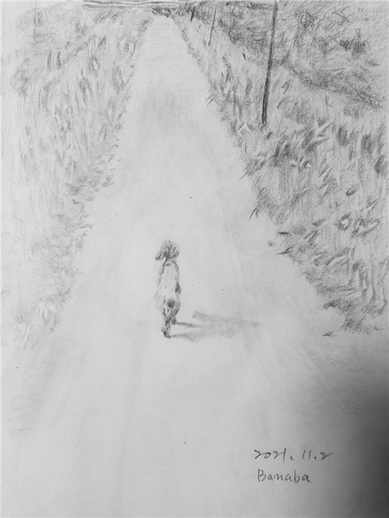 이번에는 미완성된 강아지 그림자와 길 양옆 풀숲의 완성 과정을 같이 따라가 보시겠습니다. 이 그림은 보기에는 간단해 보여도 막상 그리기에는 만만찮았습니다.