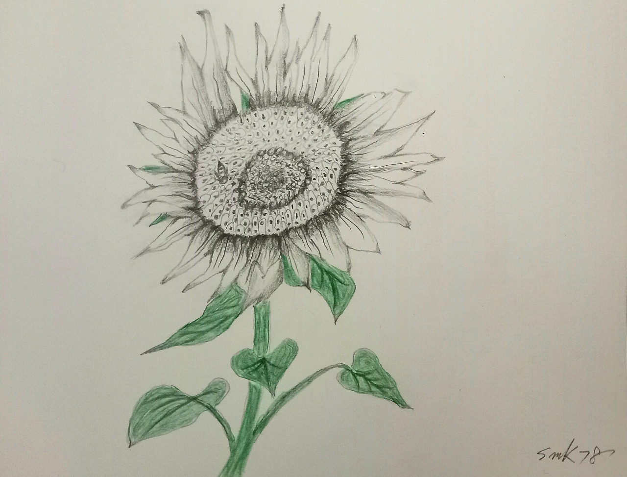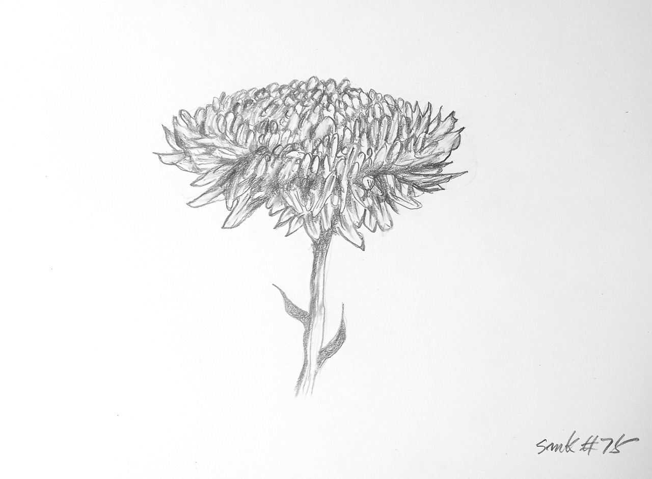 해바라기 그림은 꽃잎 수도 많고, 알맹이(많게는 2000개)도 많아서 반복적으로 그려야 할 게 많습니다. 그래서 자칫 지겨울 수도 있어 처음에는 정성 들여 그리다가 나중에는 대충 하고 싶은 충동에 빠지지요. 끝까지 그리는 인내심이 필요합니다. "참자, 참자, 끝까지 그리자..." 이런 마음으로 그리셔야 합니다. 드로잉 하면서 '인생'을 배웁니다.