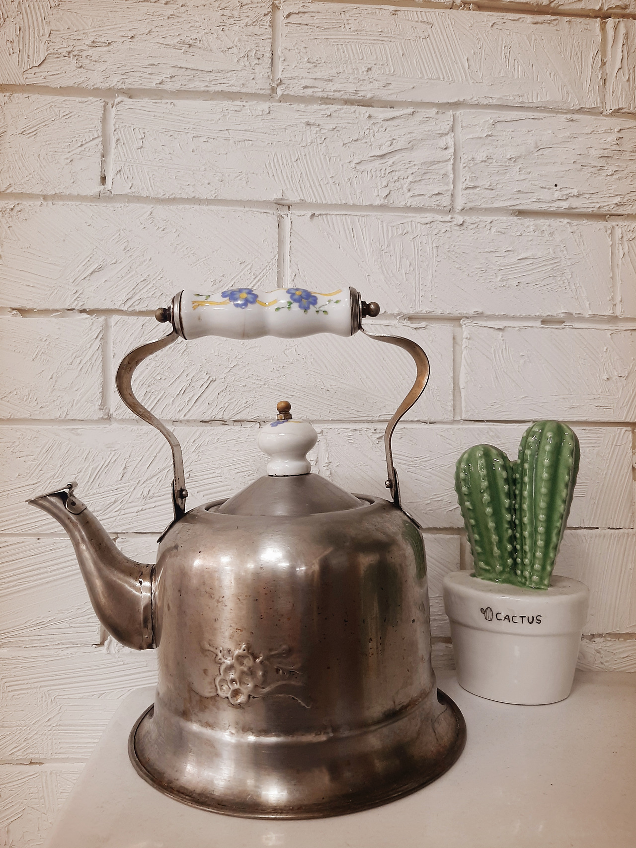스테인리스 주전자. 손잡이는 흰 바탕 도기로 파란 나비 떼가 날아다니고, 뚜껑에 붙은 대추만한 손잡이 역시 도기로 감싸졌다. 몸통 한가운데 볼록볼록한 꽃다발이 양각으로 새겨진 게 돋보였다. 바닥 지름이 15센티 정도라 누가 보아도 차 마실 때 요긴할 것으로 보였다. 귀티나고 쬐깐한 게 한눈에 들어왔다. 막 쓰는 양은 주전자와는 사뭇 달랐다. 주방에 두면 혼자 튀어서 다른 주방용품들과 겉돌 정도였다. 작업복 차림 사람들 사이에 혼자 정장 입고 화장한 아가씨 같달까. 나의 찻주전자, 첫인상은 그랬다.