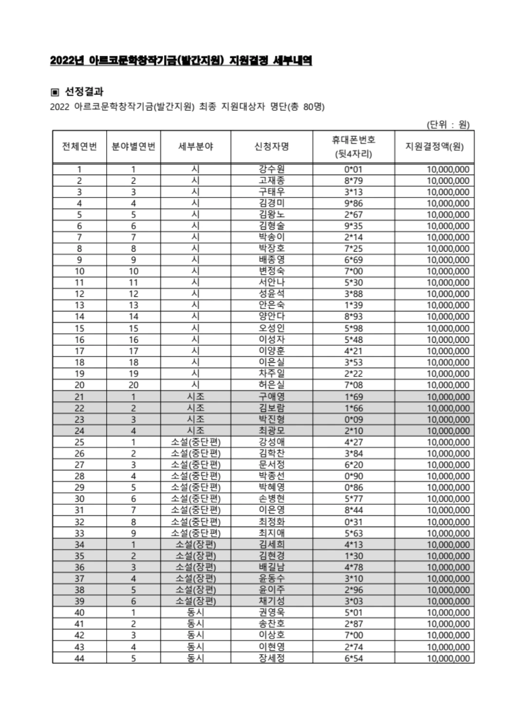오늘 한국문화예술위원에서 하는 아르코문학창작기금(발간지원)이 발표되었어요.