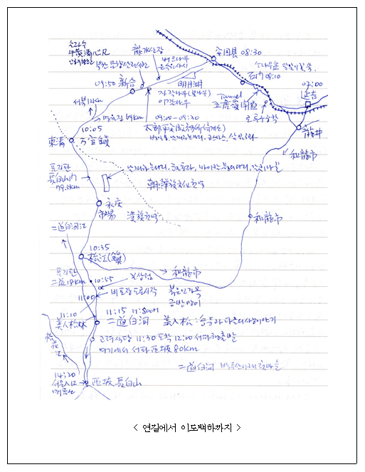 하지만 이 도보 탐사를 시작하기 위해서는 앞서 먼 길을 돌아가야 한다. 먼저 하늘길로 연길까지 빗겨 날아오른 뒤, 거기에서 백두산 서편의 도보 탐사가 시작되는 곳까지는 다시 육로를 내달려야 한다. 오후 1시 반쯤 인천공항을 출발한 비행기가 2시가 조금 넘은 시각에 장춘공항에 도착했다. 중국의 북경 표준시간이 한 시간 늦은 것을 감안하면 2시간이 채 안 걸린 셈이다. 약 1,000킬로미터의 거리를 날아온 것이다. 장춘에서는 연길까지 약 500킬로미터의 거리를 늦은 저녁 비행기로 다시 날았다. 1시간쯤의 시간이 걸렸다. 백두산에 오르기 위해서는 이제 연길에서 하룻밤을 묵은 뒤 다음날 자동차로 약 300여 킬로미터의 길을 더 달려가야 한다. 연길에서 이도백하까지 250킬로미터, 그리고 그곳에서 다시 백두산의 서쪽 산문 입구까지 70여 킬로미터를 달린다.