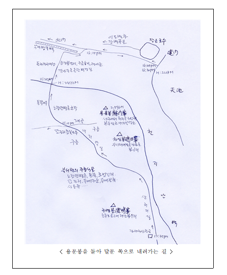 내리막길 오른편으로는 큰 봉우리 두 개가 솟아 있다. 차일봉(遮日峯)과 용문봉(龍門峯). 2,596미터 높이의 용문봉은 백두산 서쪽에서 천지를 조망해볼 수 있는 마지막 봉우리다. 우리의 발길로부터는 멀리에 있지만, 차일봉의 무너져 내릴 듯이 가파른 봉우리가 우뚝하다. 차일봉 아래쪽으로는 들쭉이 천지라는데 이제 막 싹들이 돋아나고 있는 모양이다. 검은 자주색 열매는 갈증도 풀어주고 허기도 달래준다고 하는데 그 열매는 접할 길이 없다. 더 아래쪽에는 등대시호가 군락을 이루어 자라는 곳이 있다고 하지만 그곳이 어디인지는 찾아보지 못했다.