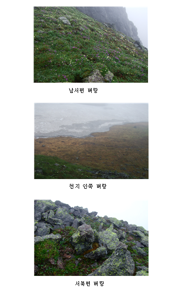 백운봉을 뒤로하고 북쪽으로 향하는 산머리 길에서는 다시 천지의 안벽을 내려다볼 수 있다. 천지 안벽 쪽으로 조금씩 흙이 무너져 내린 모습이 보이기도 한다. 이토록 가파른 벼랑이지만 흙이 붙어있고 햇빛이 드는 곳이면 어디든지 풀들이 뿌리를 내리고 있다. 흙이 무너져 내리는 칼데라 바깥쪽의 모서리에 두메자운, 두메양귀비 따위들이 위태롭게 뿌리를 내리며 꽃을 피우고 있다.