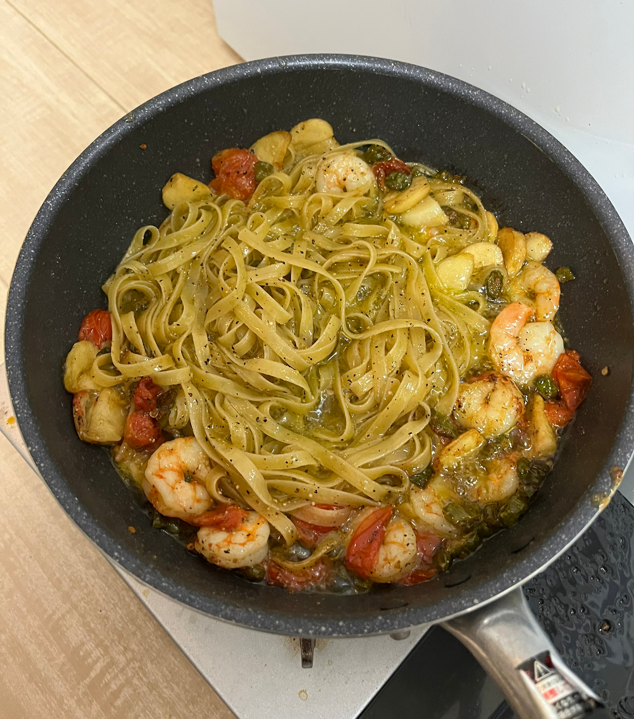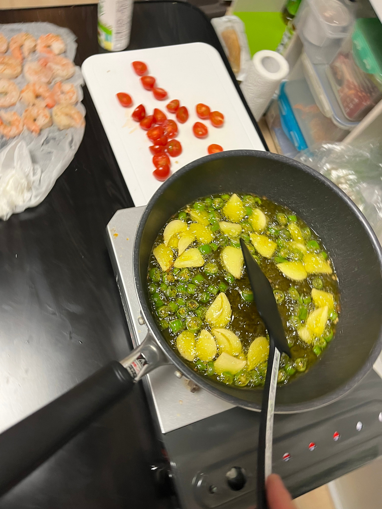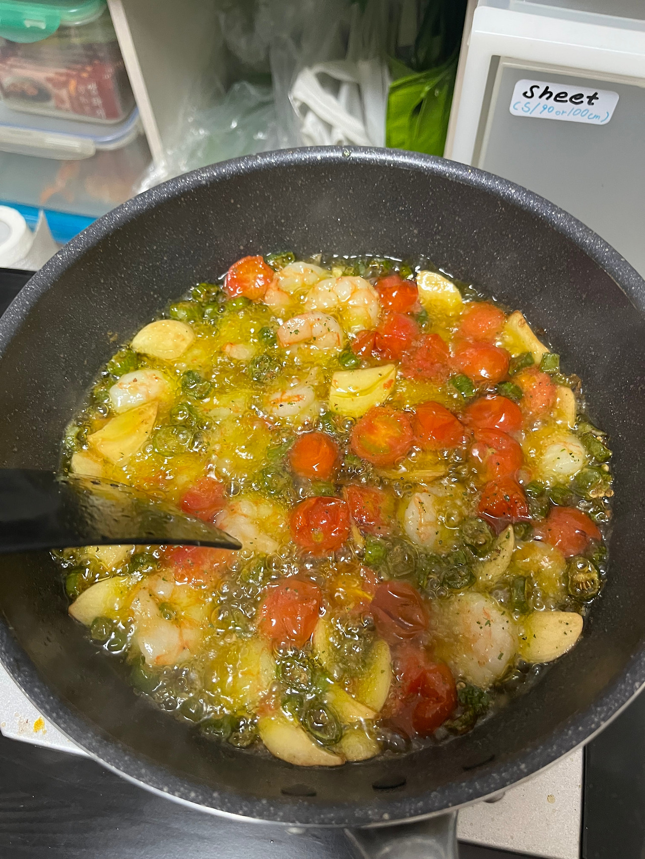 사장님은 방에서 살림을 하시다 보니까 다행히 웬만한 조리도구가 다 있었고 그걸 가지고 내가 한국에서 하던 레시피대로 열심히 요리를 했다! 하지만 원래 감바스는 페페론치노, 못해도 청양고추로는 간을 내야되는데 일본 고추는 매운 게 없다 보니까 그 매콤한 맛이 안 나서 간은 조금 밍밍했다. 심지어 파스타면도 일반적인 면이 아니라 납작한 걸로 사왔다(노답ㅎㅎ). 그래도 사장님께서 맛있게 드셔주셔서 감사했고 밤늦게까지 술을 마시며 또 인생에 관한 얘기를 나눴다. (사장님은 술을 엄청 좋아하신다. 밥만 먹으면 무조건 술 필수..)