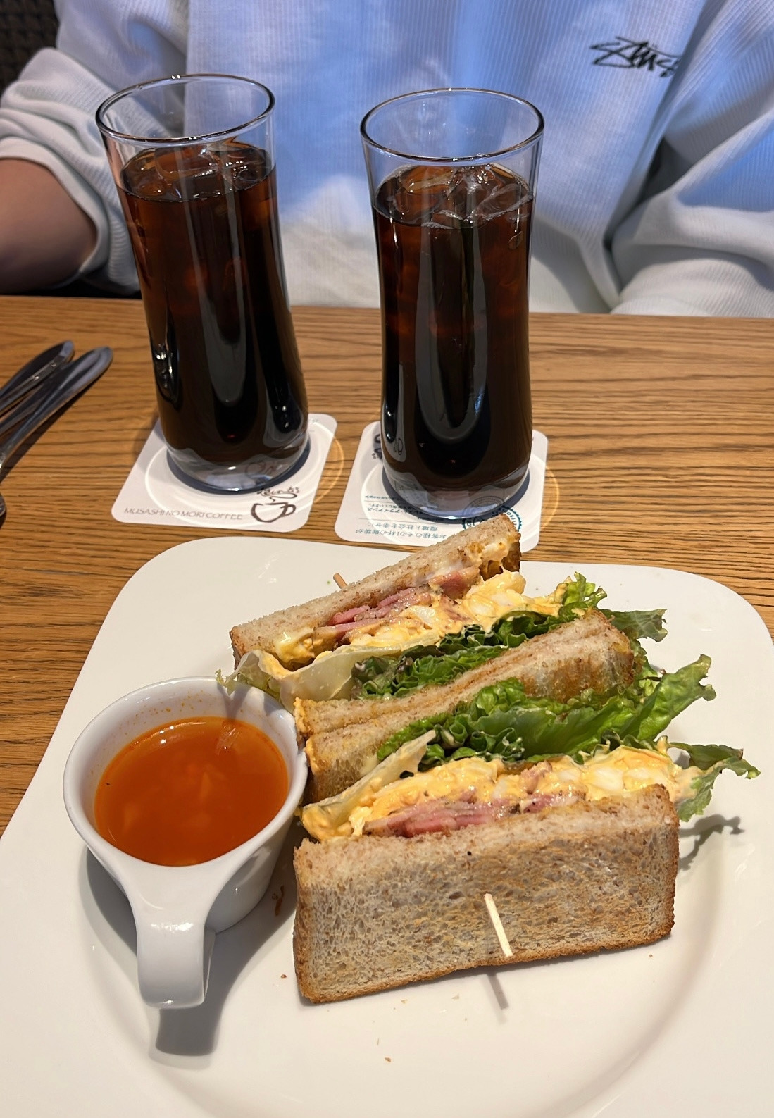가격도 저렴하고 분위기도 너무 좋았는데 역시 팬케이크 맛집이라서 그런지 팬케이크의 식감이 너무 ふわふわ(푹신푹신)해서 입에 들어가자마자 구름을 한껏 머금은 것처럼 황홀한 느낌이었다. 신기하게도 식당 안에 동양인은 안 보이고 서양인만 있었다. 그래서 뭔가 유럽에 있는 카페에 와있는 느낌도 들었다. 커피랑 샌드위치도 같이 주문했는데 양도 많고 맛있어서 아점으로 배를 채우기에 딱 충분했다.