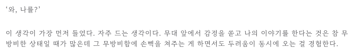 그런데 그 무방비함에 누군가가 손뼉을 쳐준다는 건, 누군가가 ‘나 자신의 본질’ 혹은 ‘내 전부’에 대해 박수를 보내는 것과 마찬가지다. 나 자신이 소중히 여기는 것은 물론 나 자체를 긍정해 주거나, 나라는 존재 그 자체에 찬탄을 보내는 느낌도 들지 않을까. 지금 이대로의 ‘나’로서도 괜찮다는 느낌. 그러나 반대로 생각하면 박수받지 못할 때는 나 자신을 부정당하는 셈이기도 하다. 그리고 박수가 언제까지 계속될지는 알 수 없다. 그러니 ‘그 무방비함에 손뼉을 쳐주는 게 하면서도 두려움이 동시에 오는 걸 경험한다’라고 하는 게 아닐까.