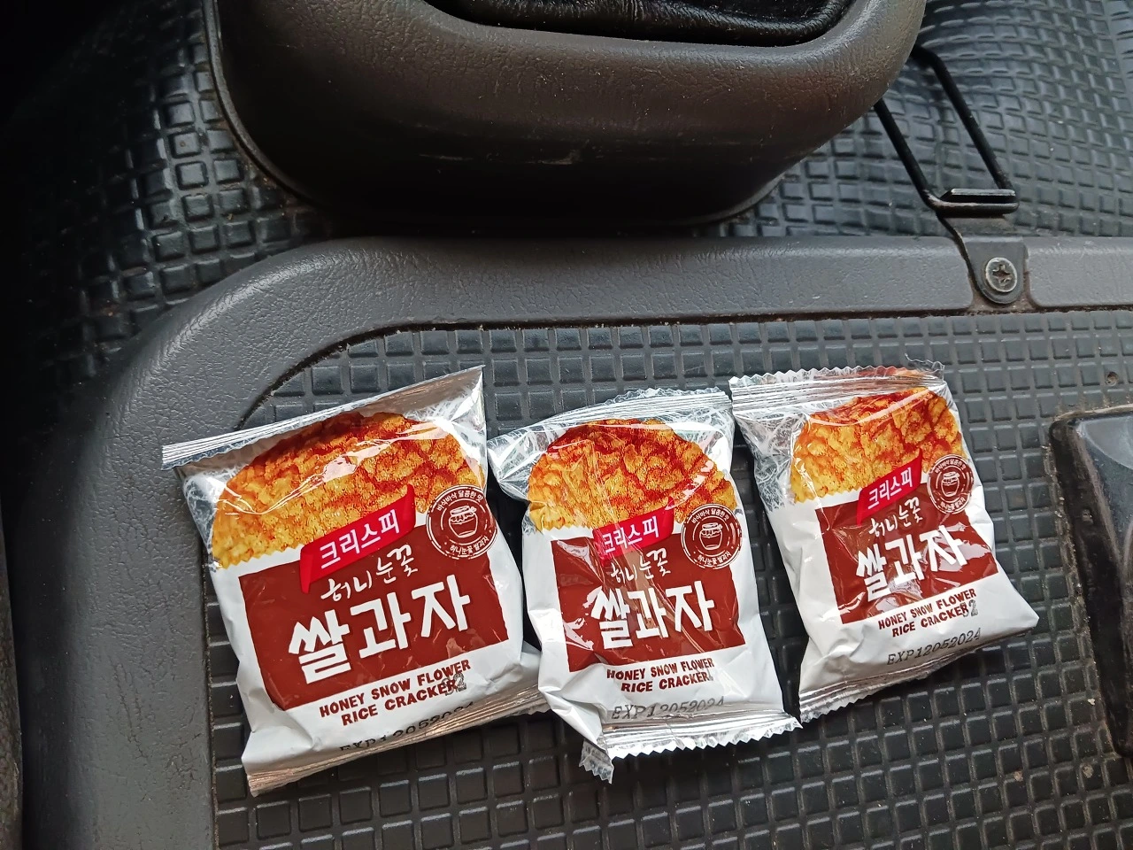 할머님의 마음이 담긴 쌀과자 세 개가 나란히 운전석 옆에 놓여있습니다.
