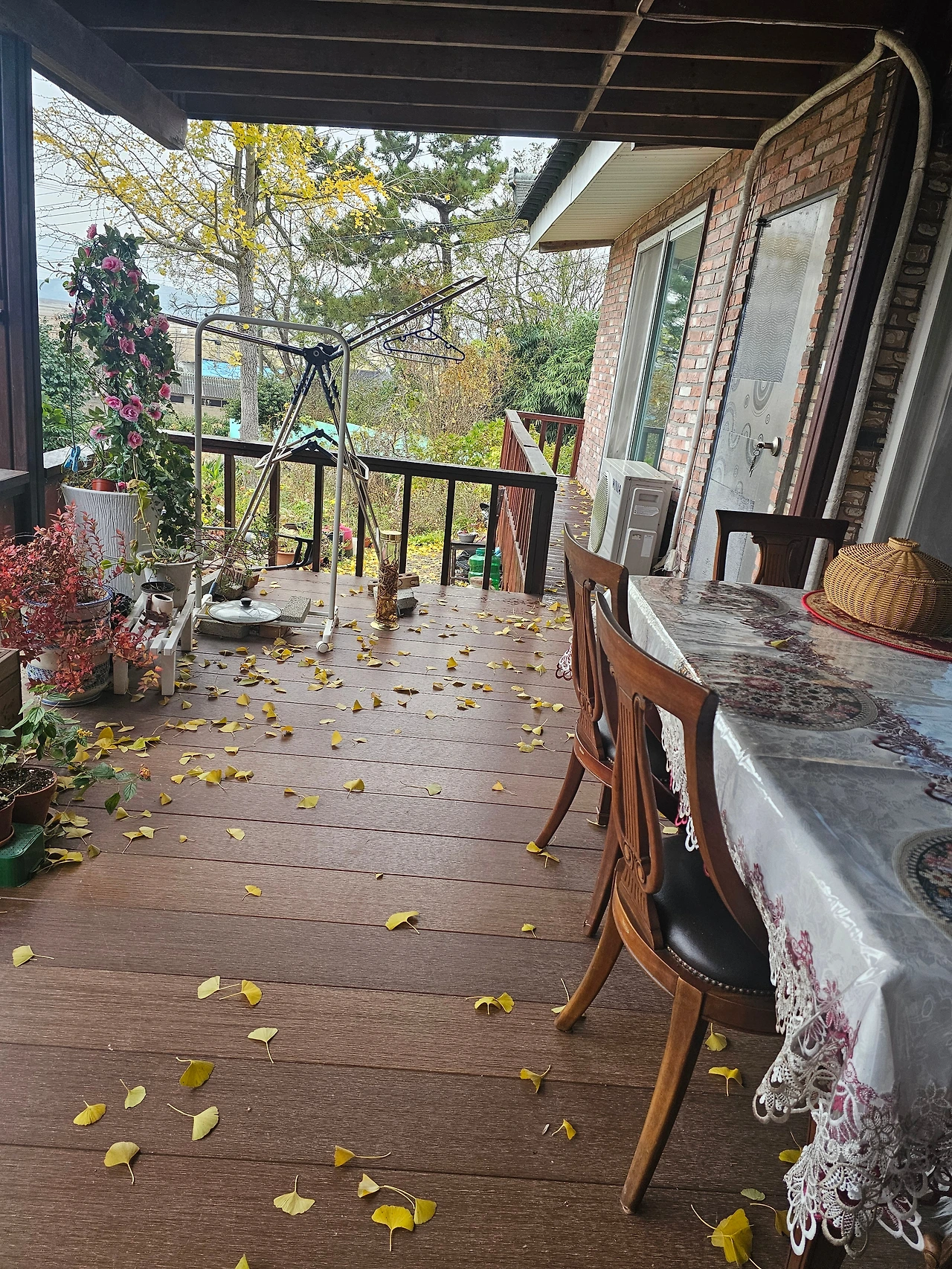 그녀의 모습이 노란 잎 더미 속에 웃고 있어