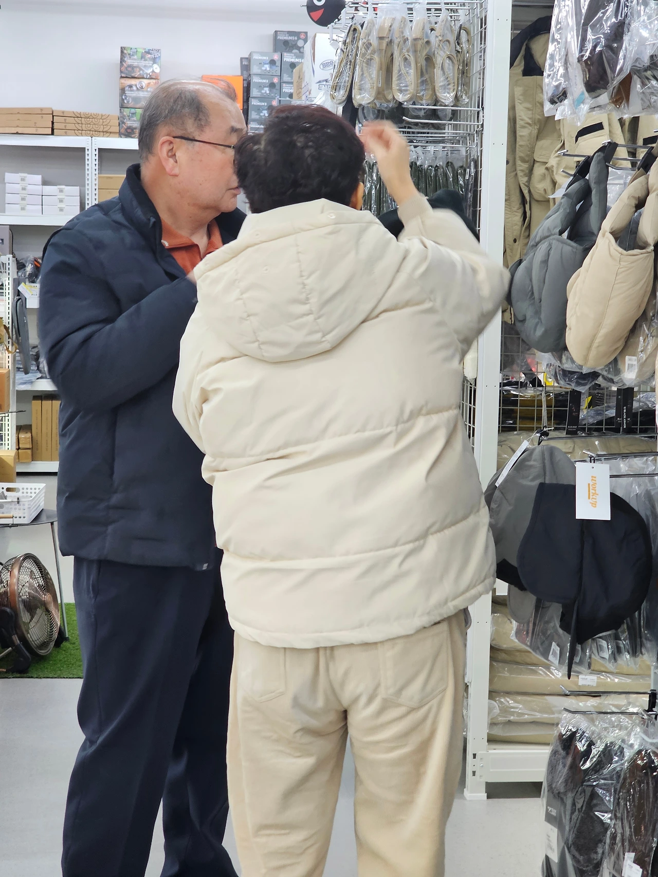 한 부부가 캠핑 스토어에서 구경을 하고 있었다 아내는 날이 추워